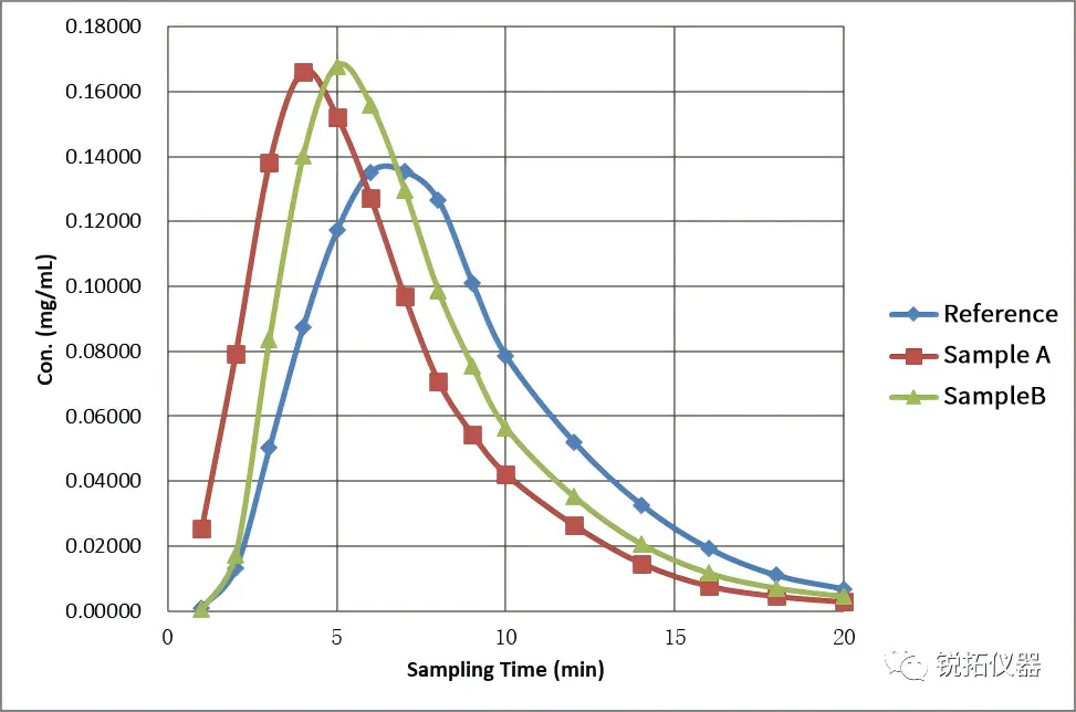 ②Distinguish:To determine the discriminatory power of the method, we conducted comparative studies using self-developed samples with different quality attributes alongside the reference preparation. We observed that: (1) For two self-developed samples with distinct quality attributes: Sample A exhibited a faster release rate than Sample B. (2) For the reference preparation and self-developed samples: the reference preparation exhibited a lower Cmax than both self-developed samples, and its time to reach Cmax (Tmax) was slower than that of both self-developed samples.